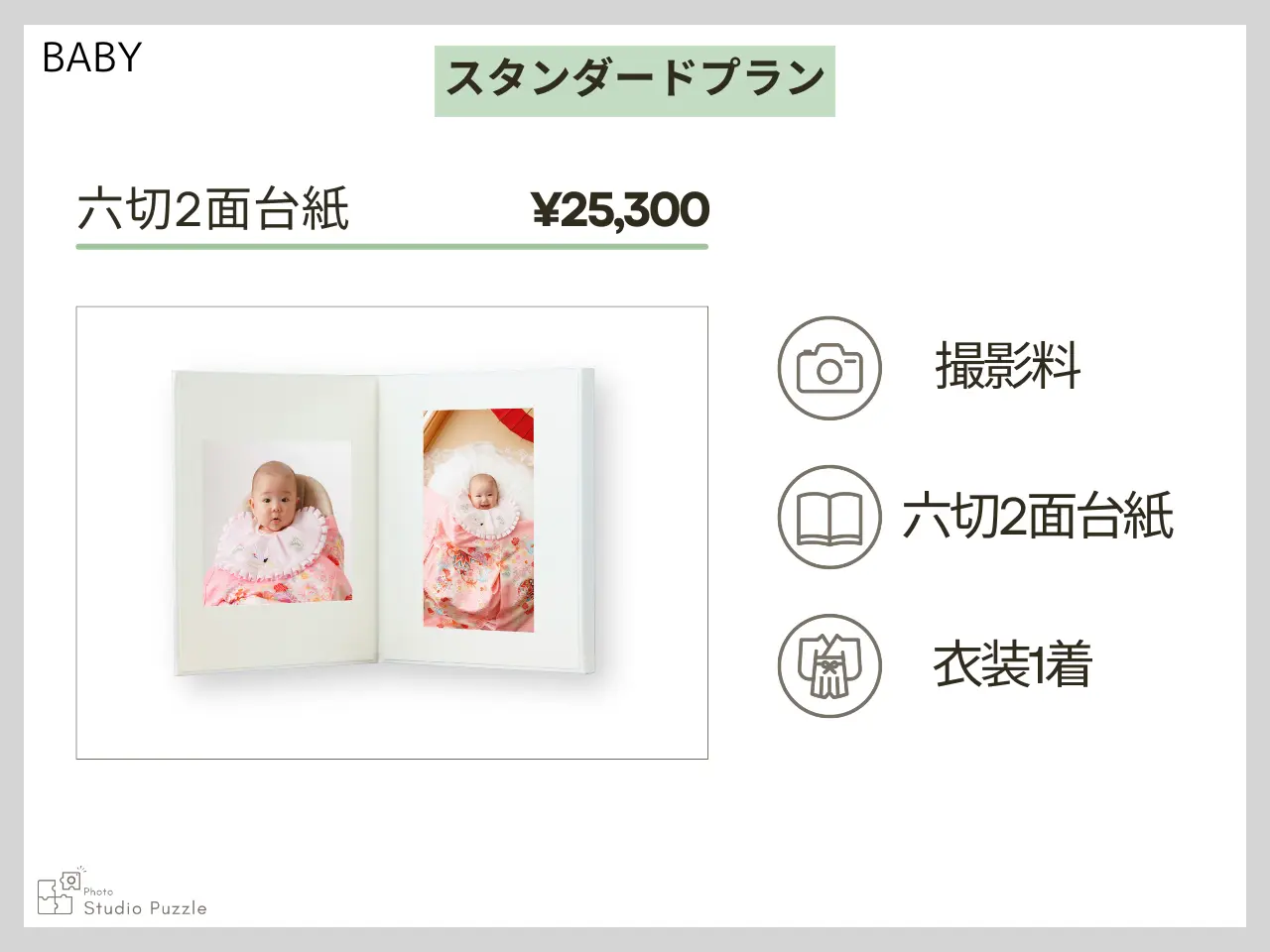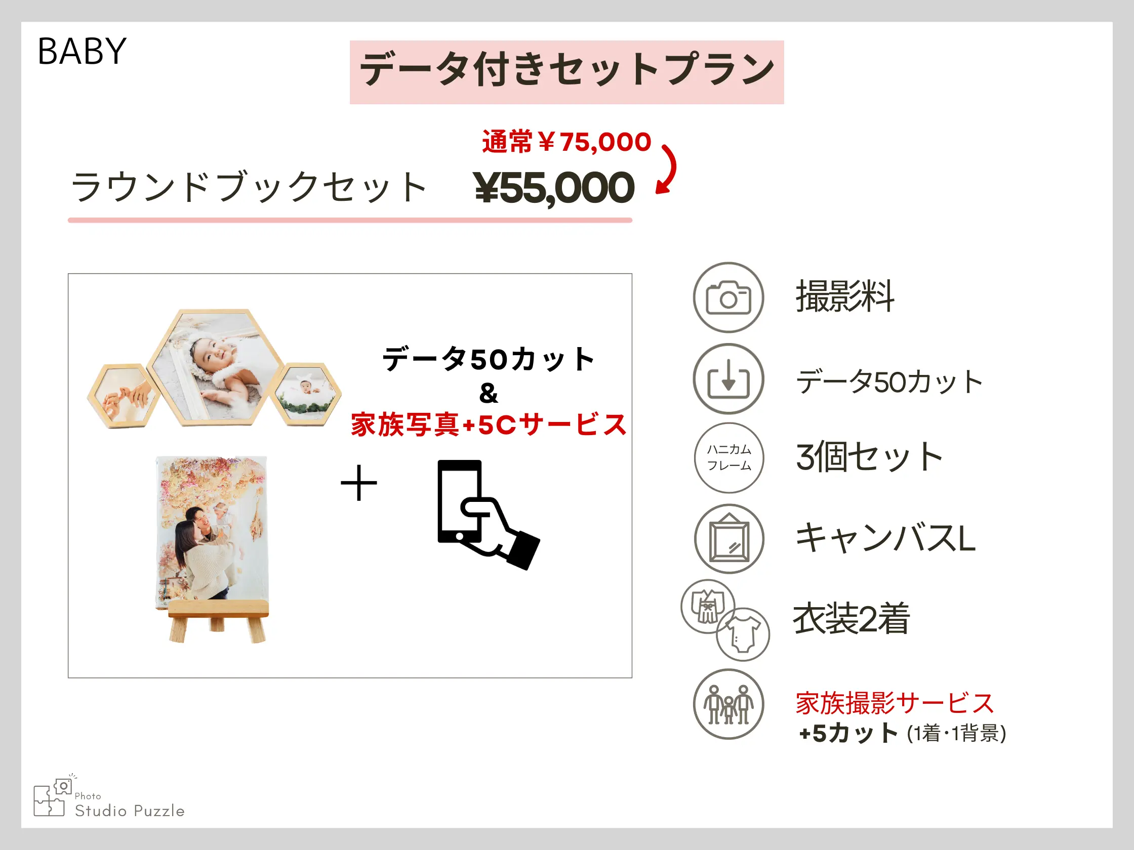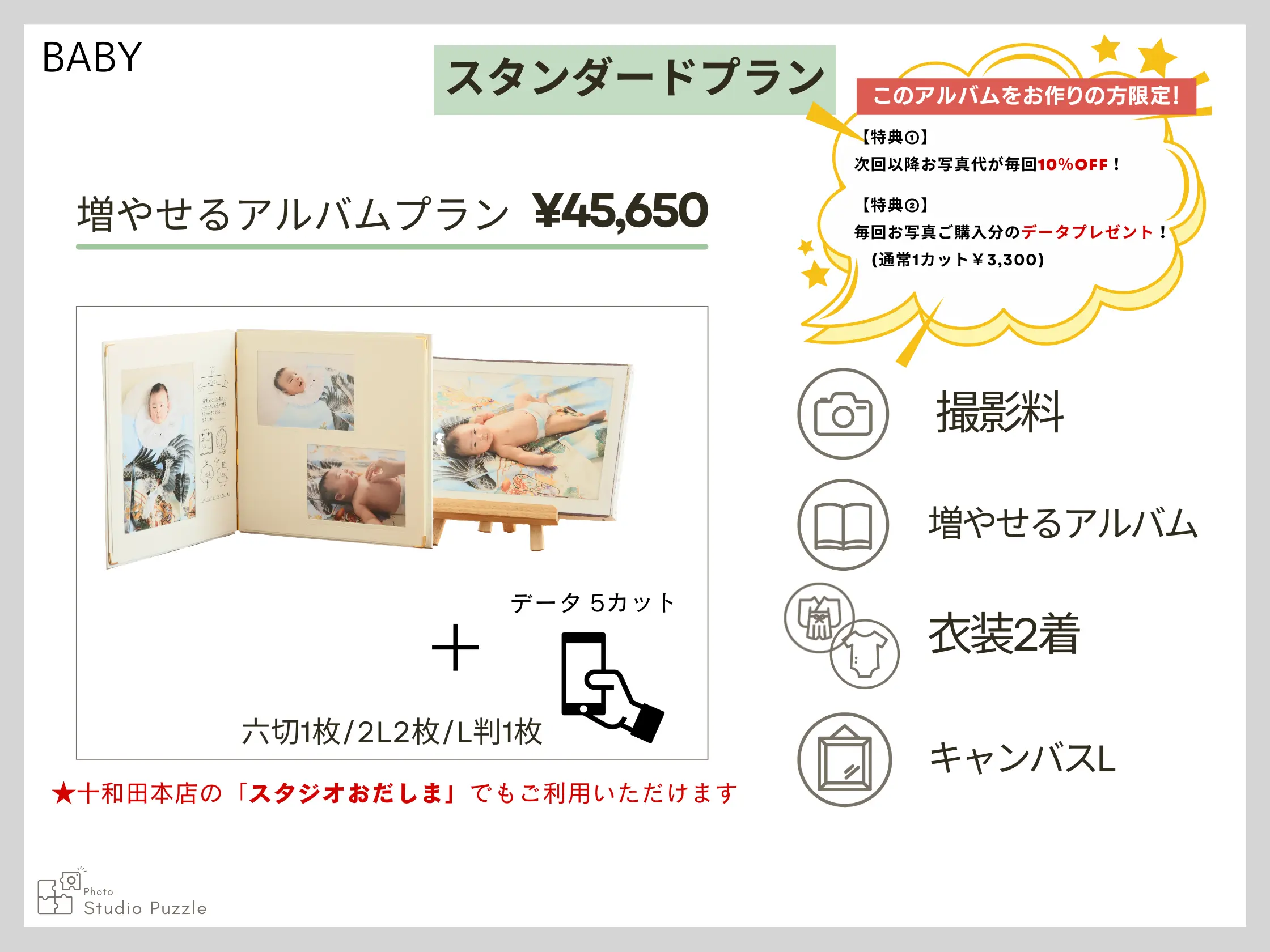 ・家族撮影追加 +¥7,920(六切1面追加) ・持込の私服でもOK(1着とみなします) ★2歳お誕生日撮影まで赤ちゃん撮影プランもお選びいただけます 【オトクな特典】 ①次回以降毎回お写真代10%引き ②毎回お写真ご購入分のデータプレゼント!