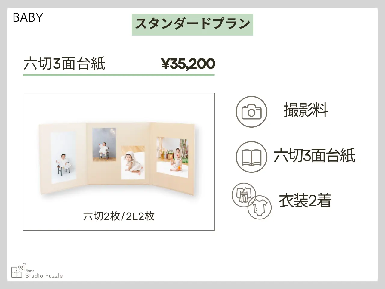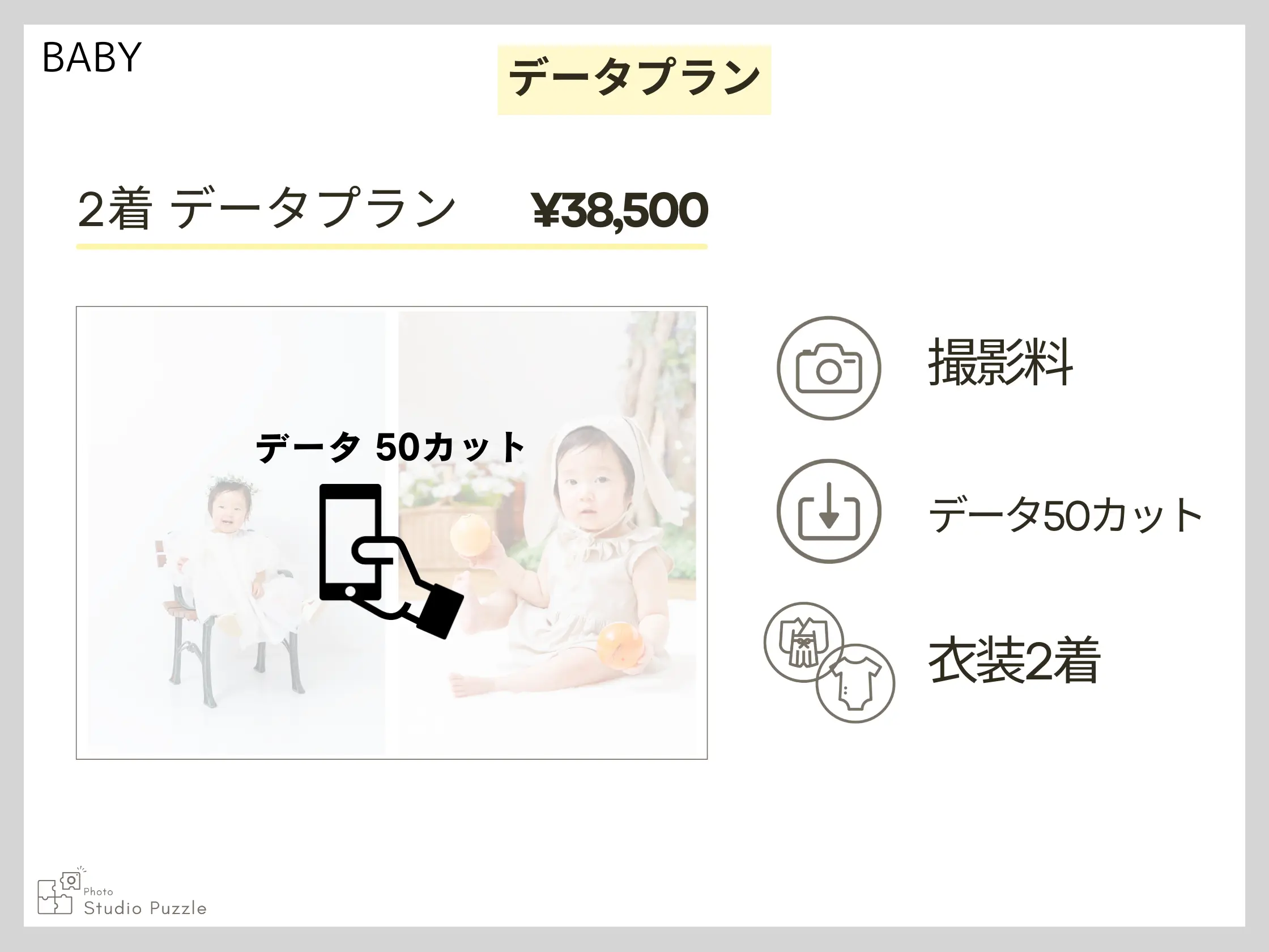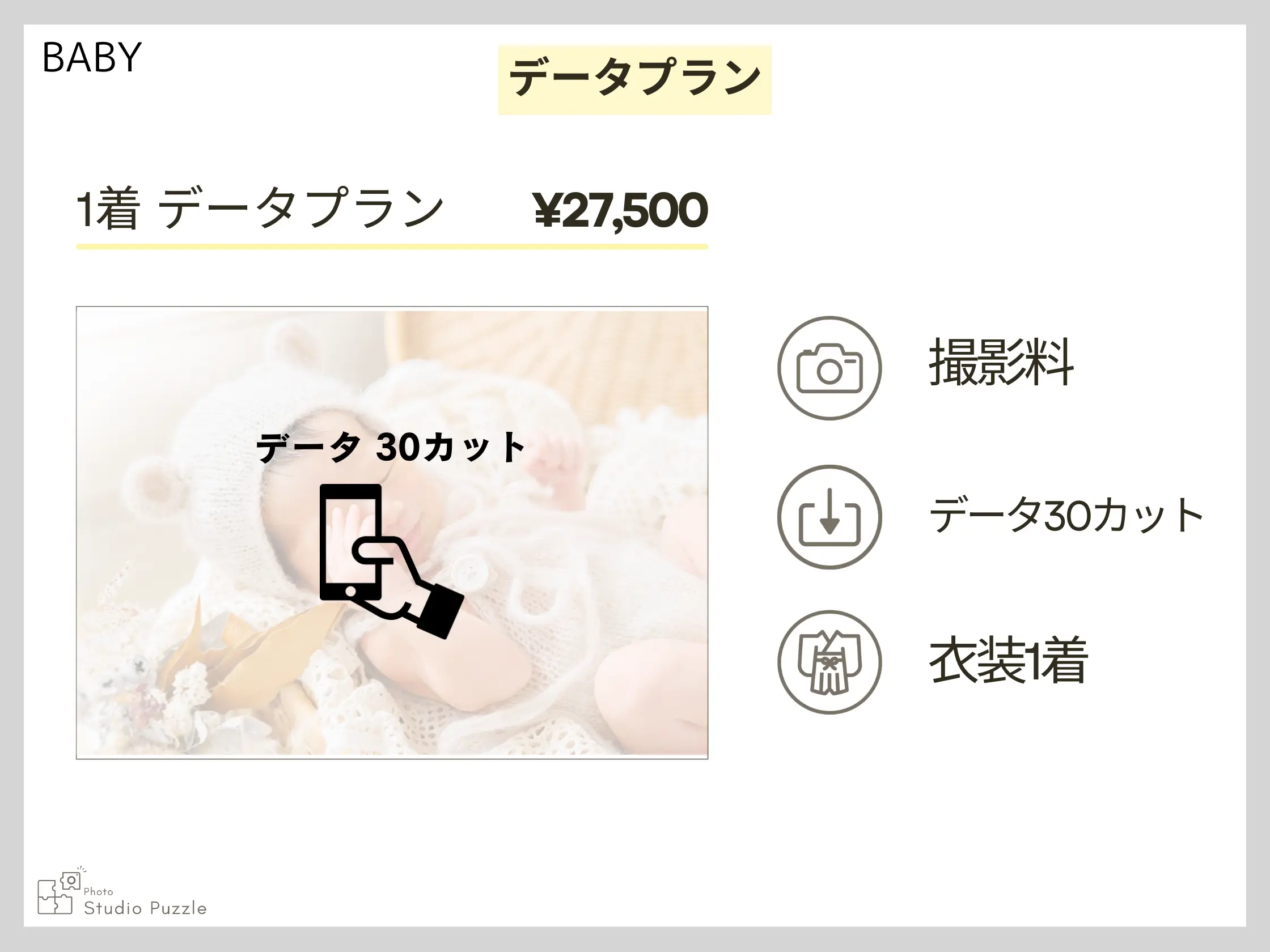 ・家族撮影追加 +¥9,900(六切1面追加) ・データ追加 1カット¥3,300/全カット¥33,000 ・持込の私服でもOK(1着とみなします) ★2歳お誕生日撮影まで赤ちゃん撮影プランもお選びいただけます