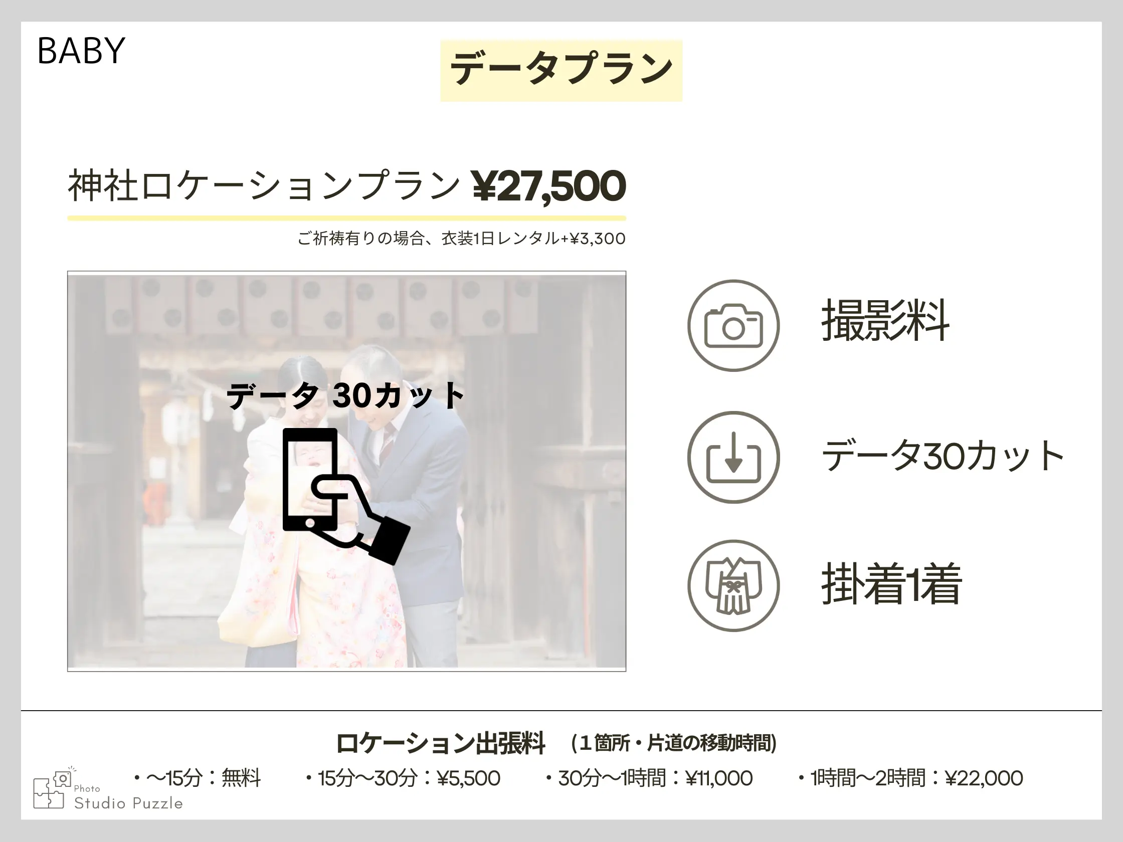 ・別途距離により出張料が追加になります ・神社により別途撮影料がかかるところもございます ・祈祷予約、初穂料は神社へ直接ご予約くださいませ ・家族撮影での人数変更(1背景) +5カット ¥5,500 ・スタジオ撮影追加 +20カット ¥11,000 ・プランのデータは、カメラマンがセレクトしたお写真を納品いたします ・オプションでアルバムもご用意しております ・データは、撮影後2週間以内にダウンロードできるURLをLINEにお送りいたします。