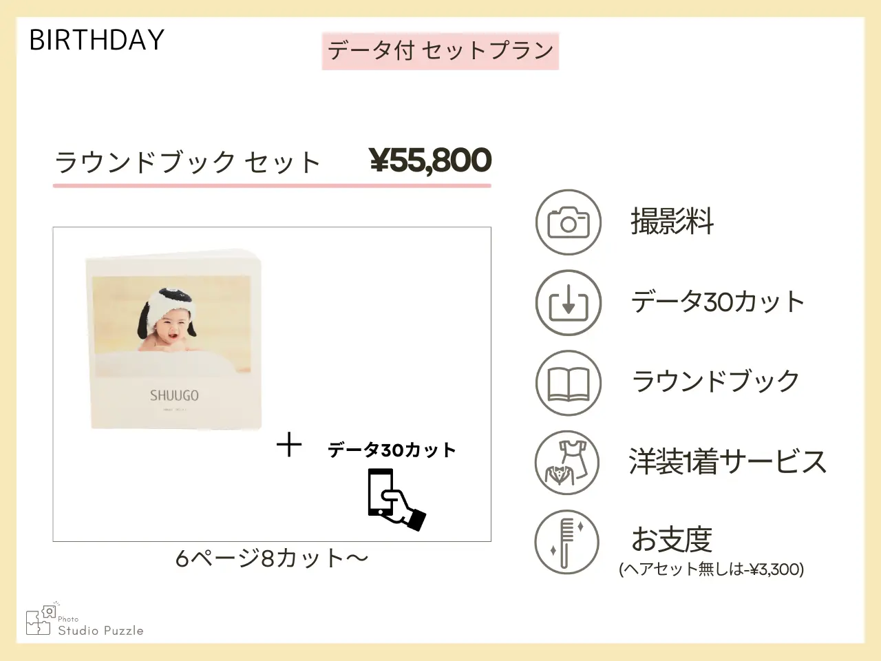 8P10カット¥58,800 10P12カット¥61,800 ・私服撮影追加 +20カット ¥11,000 ・家族撮影追加 +5カット ¥5,500(1背景、人数変更は+5C ¥5,500) ・洋装は男の子5歳まで、女の子7歳までの衣装がございます ・ロケーション撮影追加 +20カット ¥11,000 ・プランのデータは、カメラマンがセレクトしたお写真を納品いたします (アルバムのお写真はお選びいただけます) ・データは、撮影後2週間(繁忙期は3週間)以内にダウンロードできるURLをLINEにお送りいたします ★2歳お誕生日撮影までは、赤ちゃん撮影プランもお選びいただけます。(ヘアセットが必要な場合は+¥3,300)
