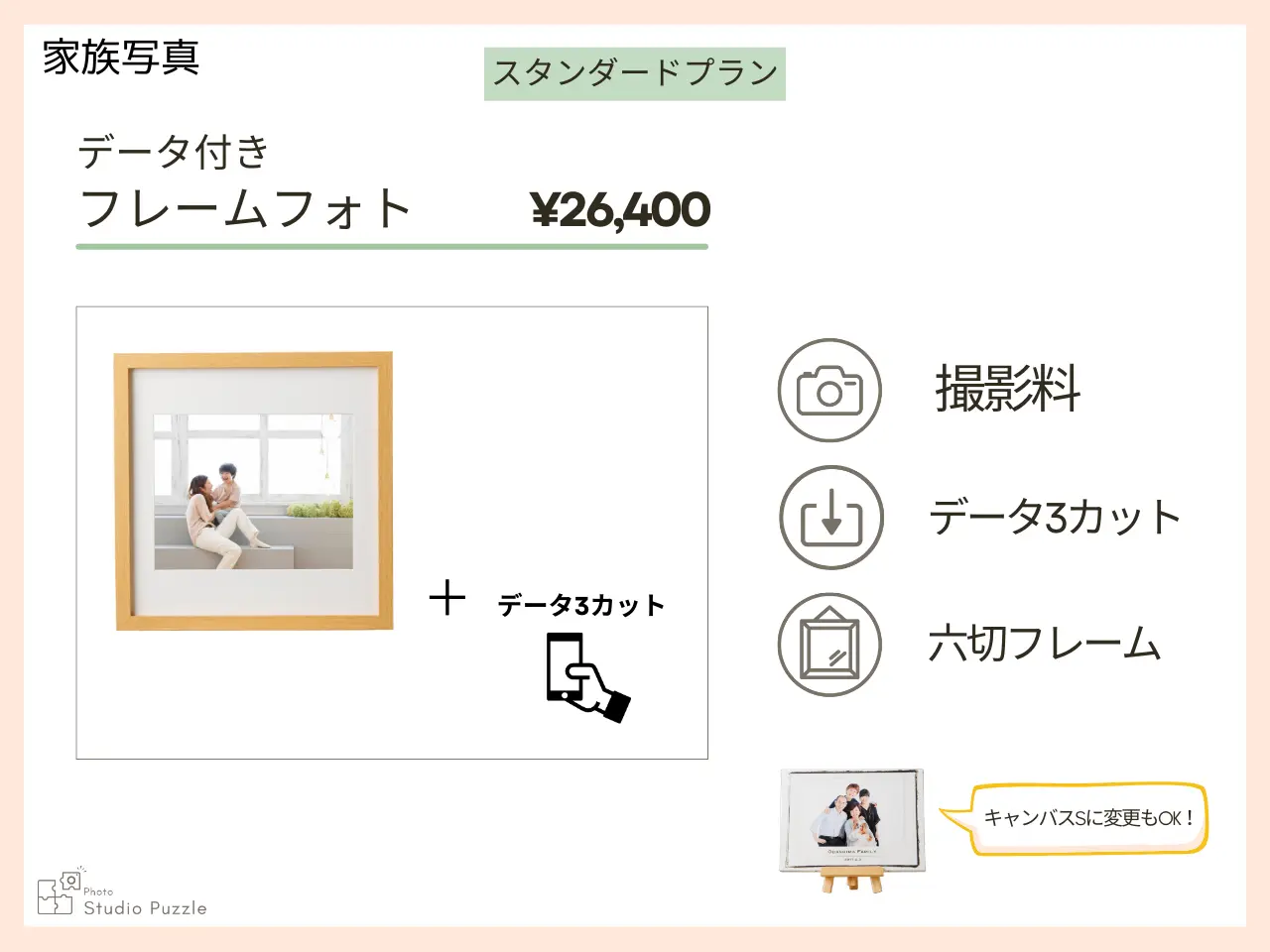 【六切フォトフレームは、キャンバスフォトSサイズに変更もできます】 ・撮影パターン追加(人数変更):六切1枚¥8,800またはデータ1カット¥8,000 ・文字入れ +¥1,100 ・データ追加 1カット¥3,300/全カット¥33,000