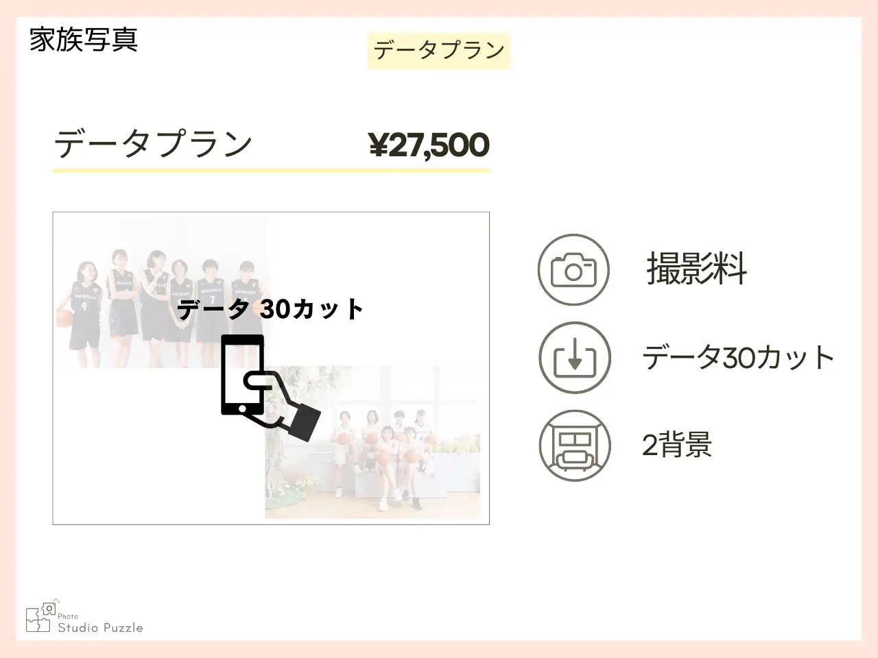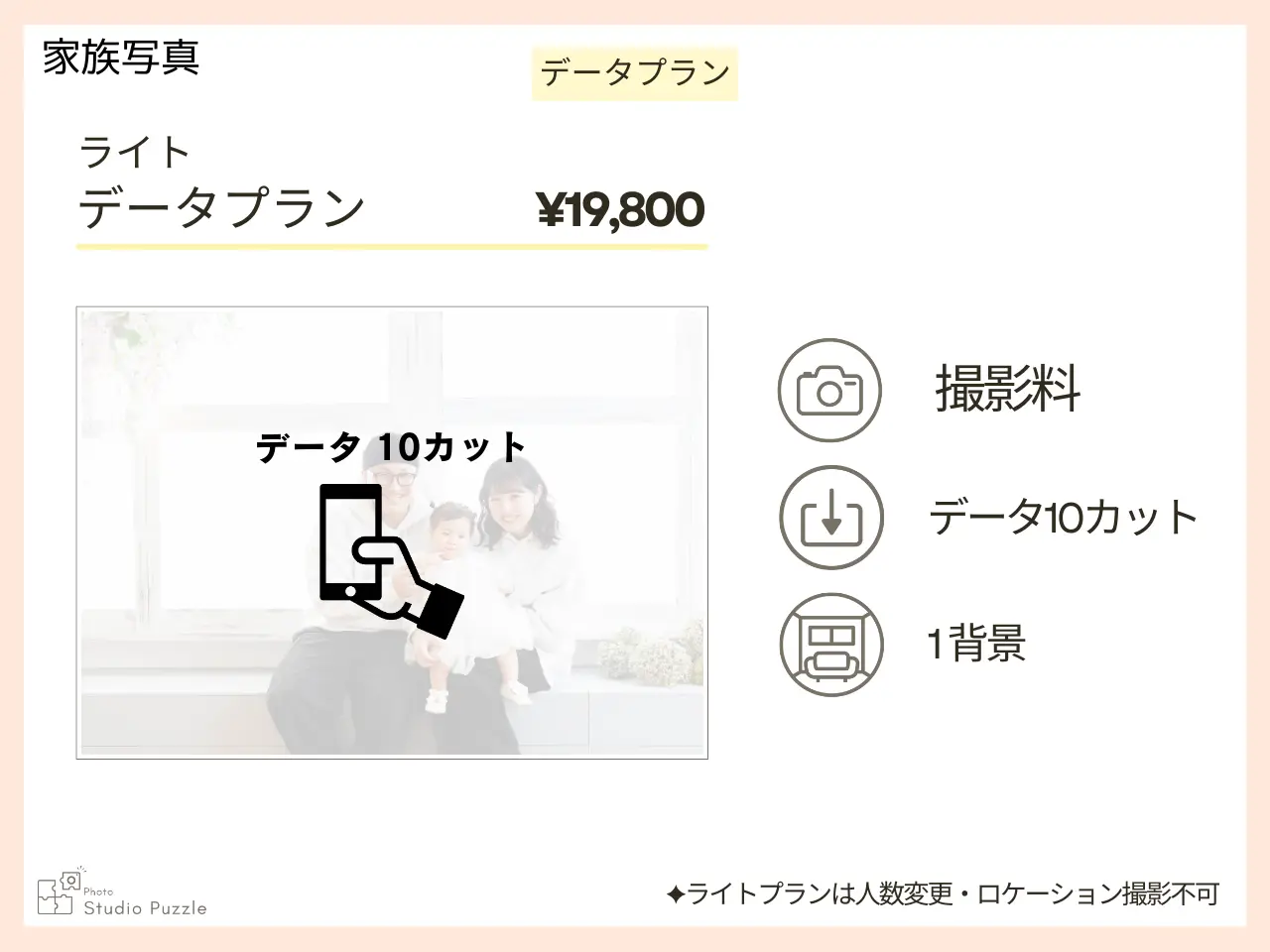 ・人数変更 +5カット¥5,500(1背景) ・ロケーション撮影追加 +20カット¥11,000(1箇所) ・プランのデータは、カメラマンがセレクトしたお写真を納品いたします ・データは、撮影後2週間(繁忙期は3週間)以内にダウンロードできるURLをLINEにお送りいたします
