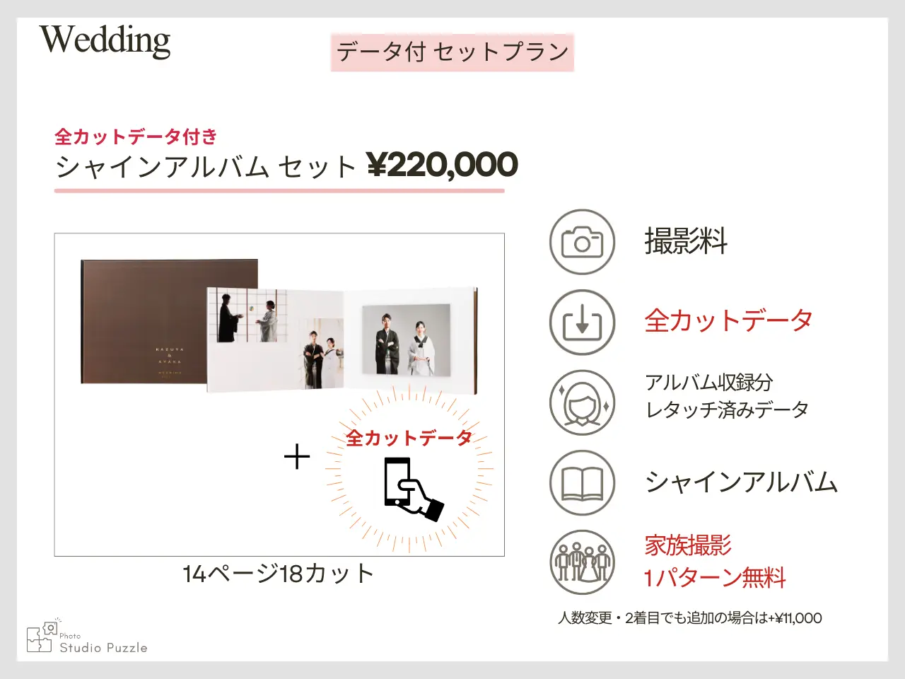 ・衣装のご用意はございませんので、近隣の美容室をご紹介しております。 ・家族撮影追加は+5カット ¥11,000(1背景) シャインアルバムは1パターン無料! ・ロケーション撮影追加は +20カット ¥11,000(スタジオ撮影なしで、ロケのみの場合は出張料のみ) ・プランのデータは、カメラマンがセレクトしたお写真を納品いたします(アルバムのお写真はお選びいただけます) ・データは3週間以内にダウンロードできるURLをLINEにお送りいたします ・オプションで全カットデータもご用意しております